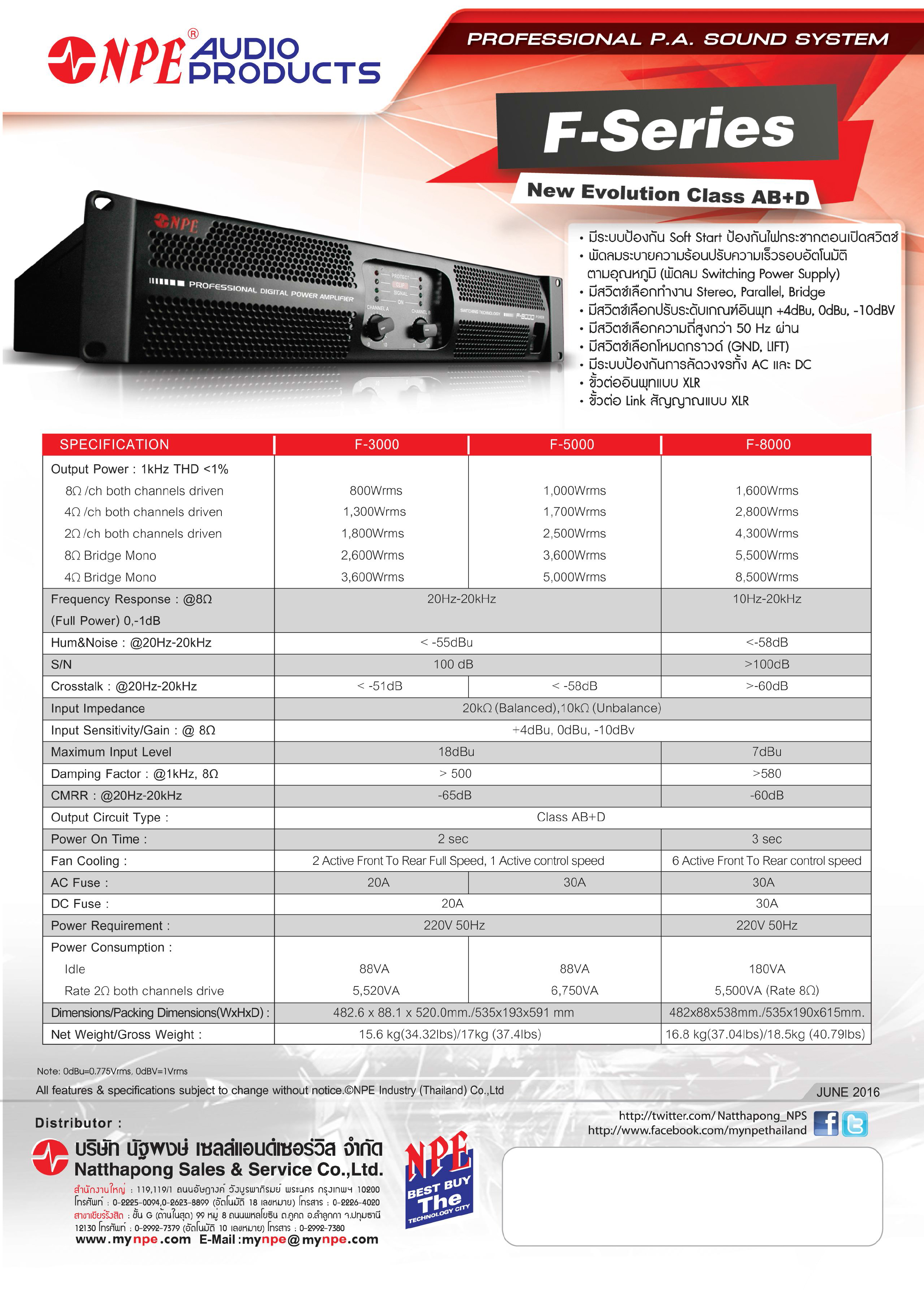 2,500Wrms @ 2 Ohms F-5000 สามารถนำไปใช้งานในโหมด Bridge Mono เมื่อต้องการกำลังที่สูงขึ้นได้และมีน้ำหนักเบา เหมาะกับการใช้งานทุกระดับ