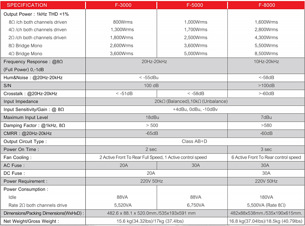 F-5000 มีกำลัง 1,000Wrms @ 8 Ohms, 1,700Wrms @ 4 Ohms,